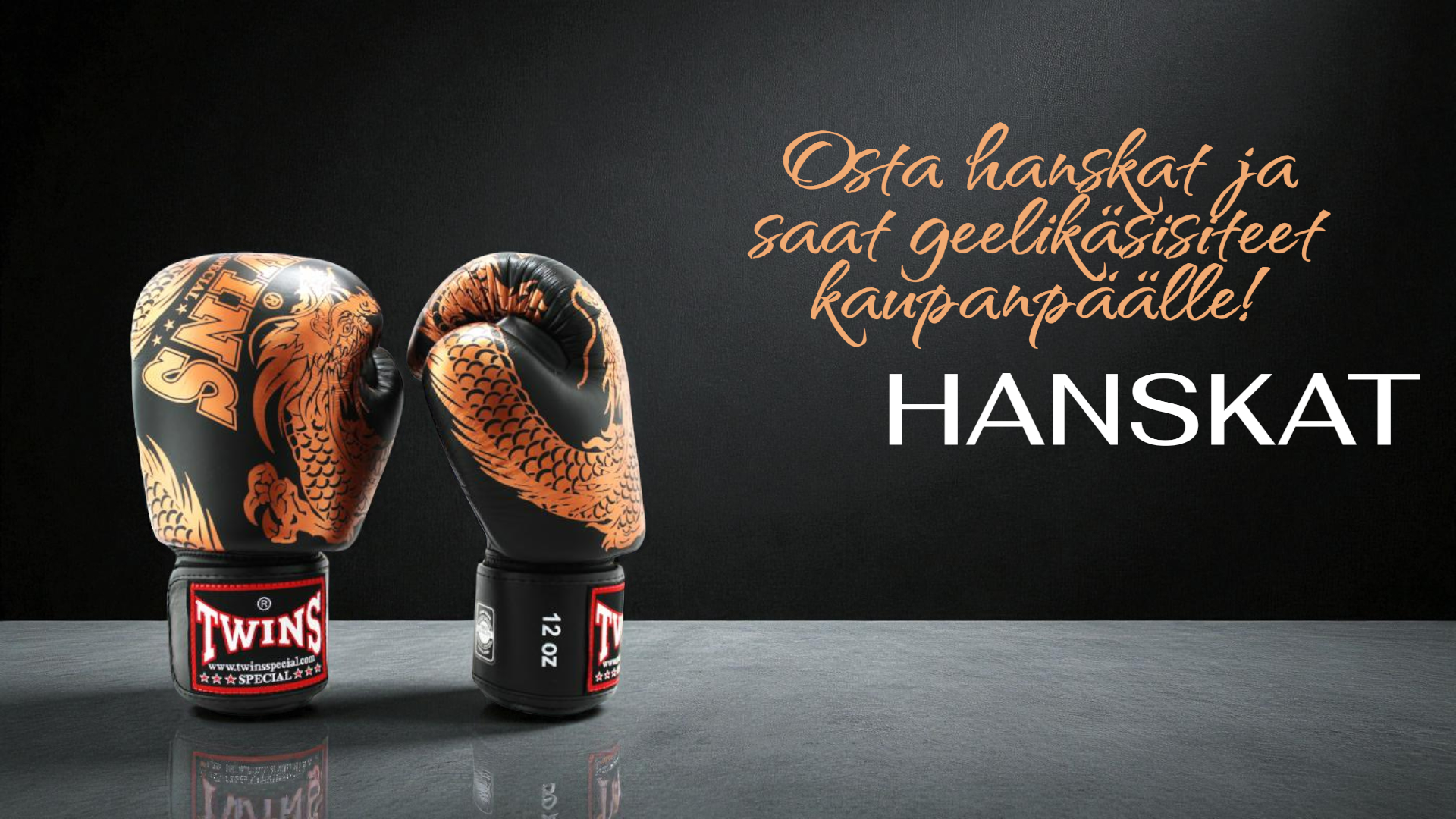 Nyt kannattaa suunnata ostoksille! Nyrkkeilyhanskojen ostajalle geelikäsisiteet (arvo 12€) ja säärisuojien ostajalle kyynärpääsuojat (arvo 16€) kaupan päälle! Tuotteet lisätään lähetysvaiheessa automaattisesti tilauksiin.